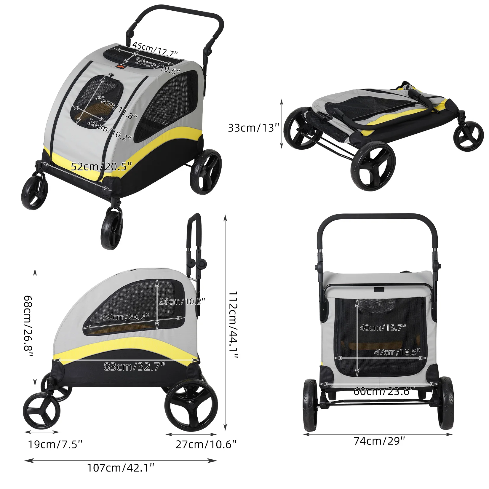 Make outdoor adventures easier with the Extra Large Dog Stroller Buggy, perfect for medium to large dogs. This portable stroller features 4 wheels for stability, a breathable mesh window for ventilation, and an adjustable handle for comfortable pushing.