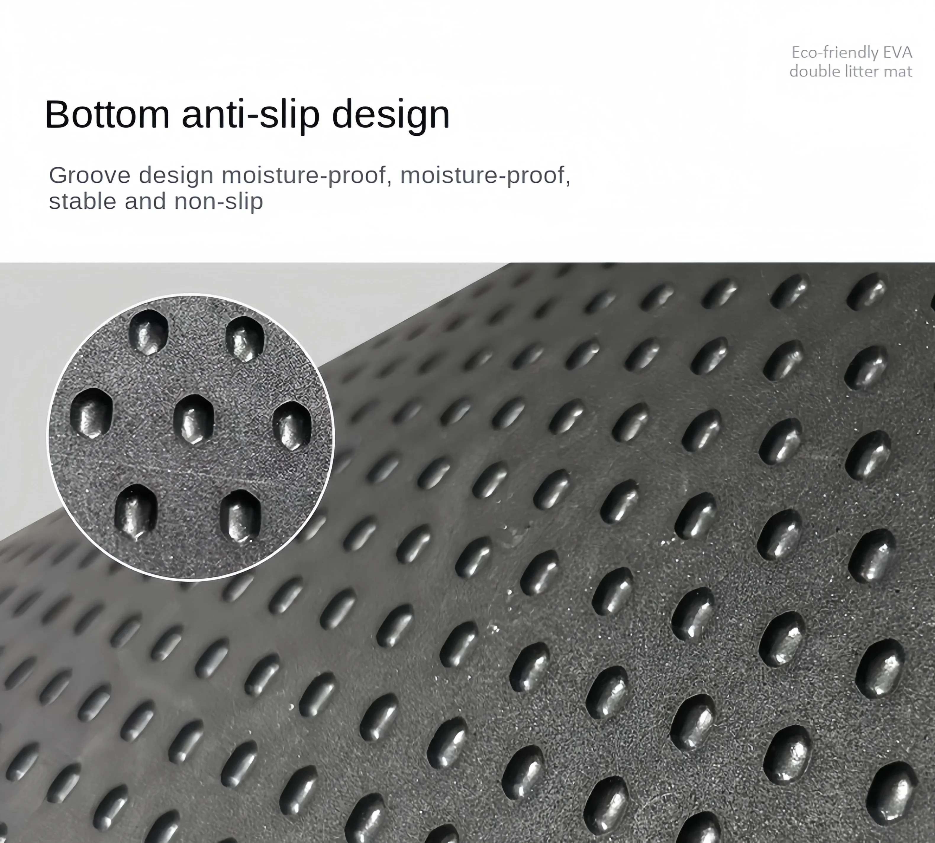 Keep your home clean with this large, waterproof cat litter mat, designed for use with litter boxes and pet toilets. Made from durable EVA material, the double-layer construction effectively traps litter, sand, and debris while preventing spills and protecting floors. The waterproof surface is easy to clean, ensuring hygienic maintenance and reducing odors. Non-slip backing keeps the mat securely in place, even with active cats or multiple pets. Ideal for indoor use, it provides a comfortable and safe surface for your cat to stand on while using the litter box. Lightweight yet sturdy, it’s easy to move and maintain, making daily cleaning hassle-free. A practical and essential accessory, this mat helps keep your living space tidy while supporting your pet’s hygiene habits.